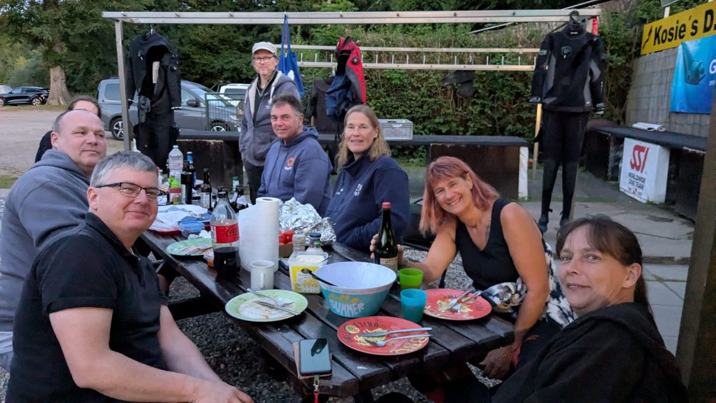 Am nächsten Tag geht es ins Wasser. Jedes Team hat ein Übungswrack im Basis-Parcours zugeteilt bekommen. Die Arbeitsbedingungen hier sind für ein Kursprogramm wie geschaffen. Es wird gemessen, gezeichnet, gefilmt, photogrammetriert – und ganz nebenbei noch in einem anderen Seeabschnitt noch ein Suchgebiet per Side-Scan-Sonar erfasst. Den erfolgreichen Abschluss des ersten Praxis-Tags beschließen wir mit einer Grillparty auf Kosie’s Tauchbasis.