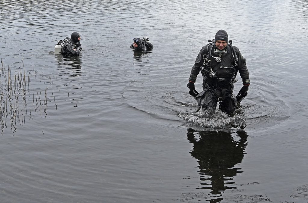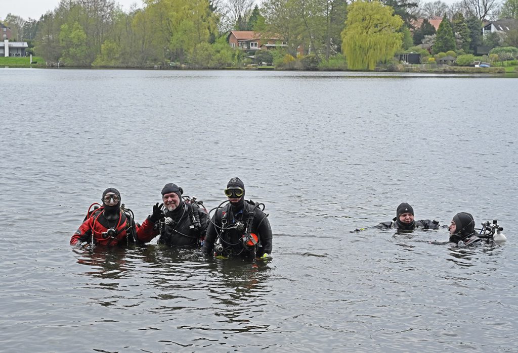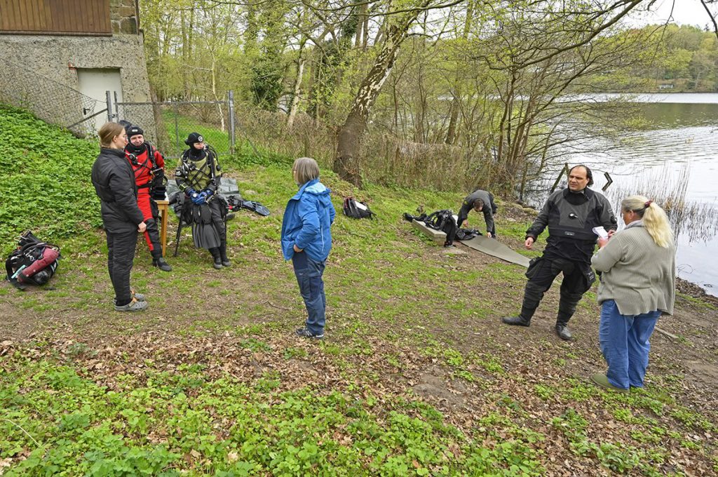 Standortwechsel zum Großensee. Eigentlich ist das Gewässer zum Tauchen nicht freigegeben. Doch die Gemeinde gibt uns eine Sondererlaubnis. Nach einem eingehenden Briefing gehen die Teams ins Wasser. Die Bojen markieren einen Parcours mit kleineren Bootswracks, die während der Forschungskampagne zufällig gefunden wurden.