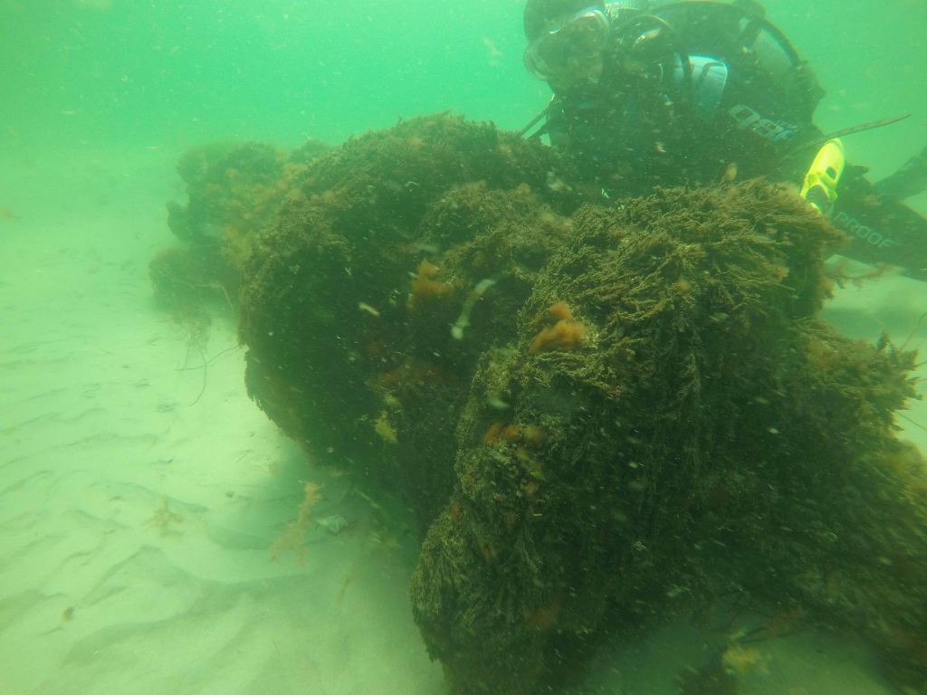 Der steife Nordost-Wind verwehrt uns leider den Einsatz auf dem Puttgardenriff. Stattdessen beginnen wir die Arbeiten am „Ausweichwrack“. Der Kriegstransporter Erna Gaulke ist 1945 vor der Westküste gesunken.