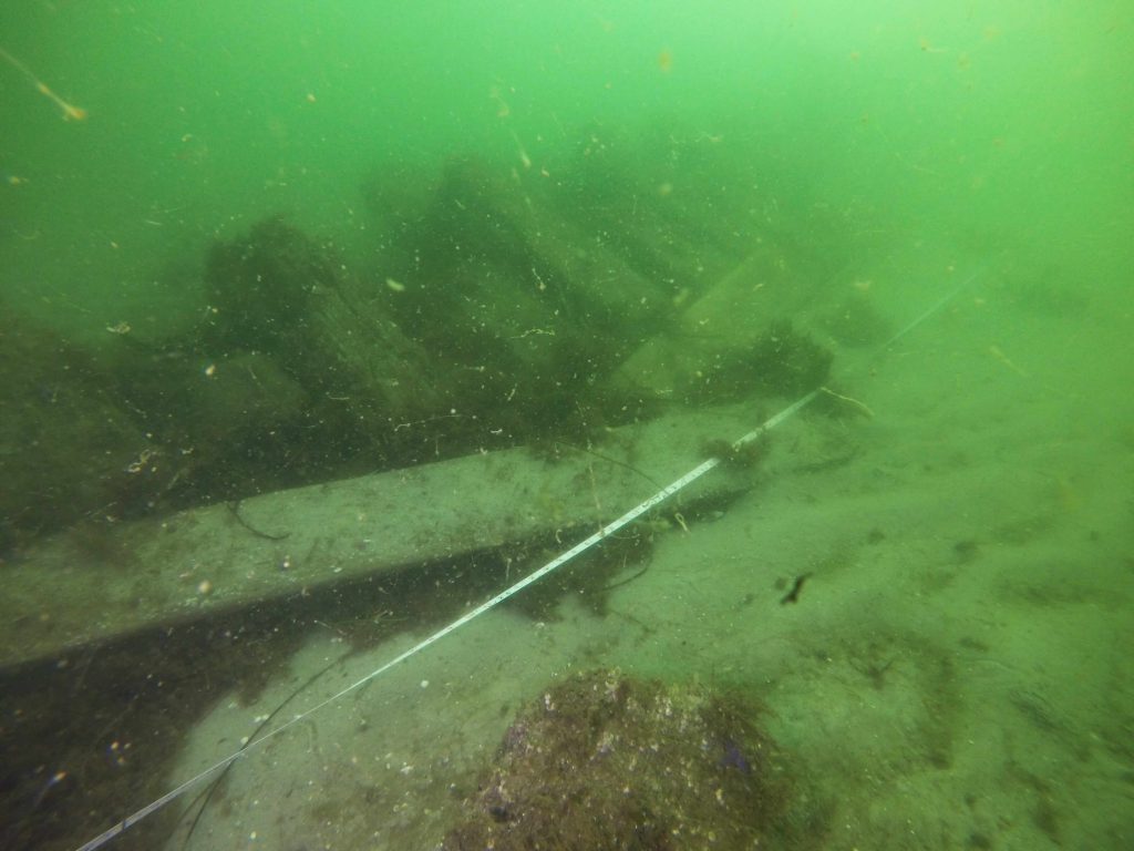 Im Oktober laufen Teile des Teams nochmal kurzfristig aus, um erste Vermessungen am Steinsegler vorzunehmen. Teile des Wracks werden grob vermessen, teils gezeichnet oder fotografisch festgehalten.